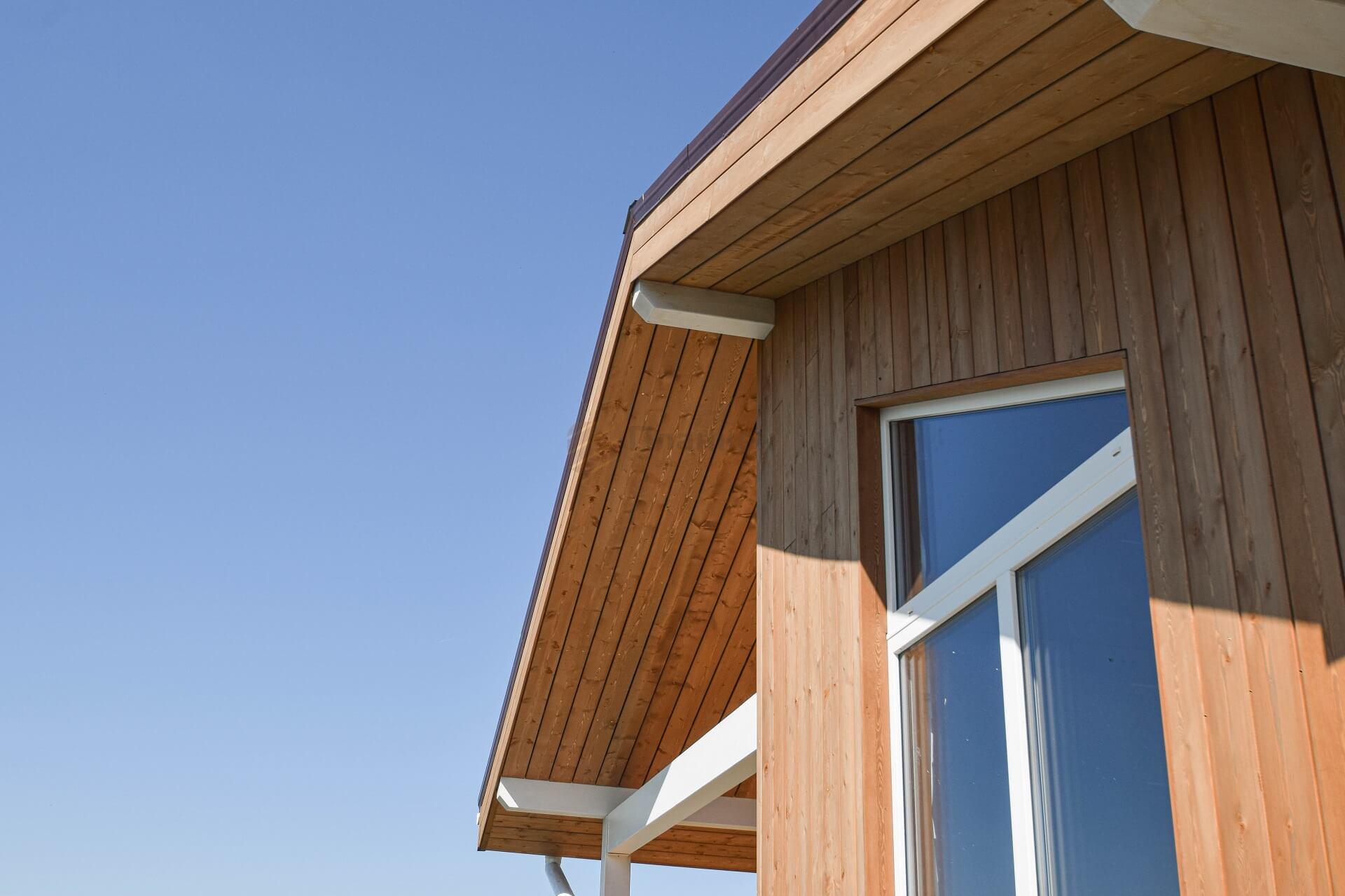 Свесы должны гармонично вписываться в экстерьерную композицию. Если дом и крыша оформлены в премиум-стиле, с использованием дорогих натуральных материалов, то и подшивка должна соответствовать статусу. Стоит использовать планкен сорта «Экстра», который не содержит изъянов и выглядит богато. Из пород дерева наиболее долговечной и выгодной по стоимости будет лиственница. Природный узор ее древесины смотрится невероятно.